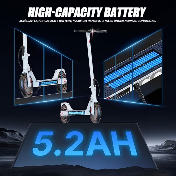 - 【Enhanced Battery Performance】Powered by a 187W battery, this electric scooter for adults offers a range of 12 miles on a single charge with a quick 5-6 hour recharge. Its foldable design and Cruise Control make it a practical e-scooter for city travel