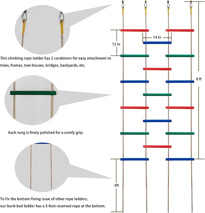 - To solve the problem of difficult bottom - fixing of other rope ladders, our bunk bed ladder has a 3 - foot - long rope reserved at the bottom. Besides, this climbing rope ladder comes with 2 carabiners for easy attachment to trees, climbing frames, tree houses, rope bridges, backyard playgrounds, etc. It's also easy to assemble and disassemble without extra tools.
