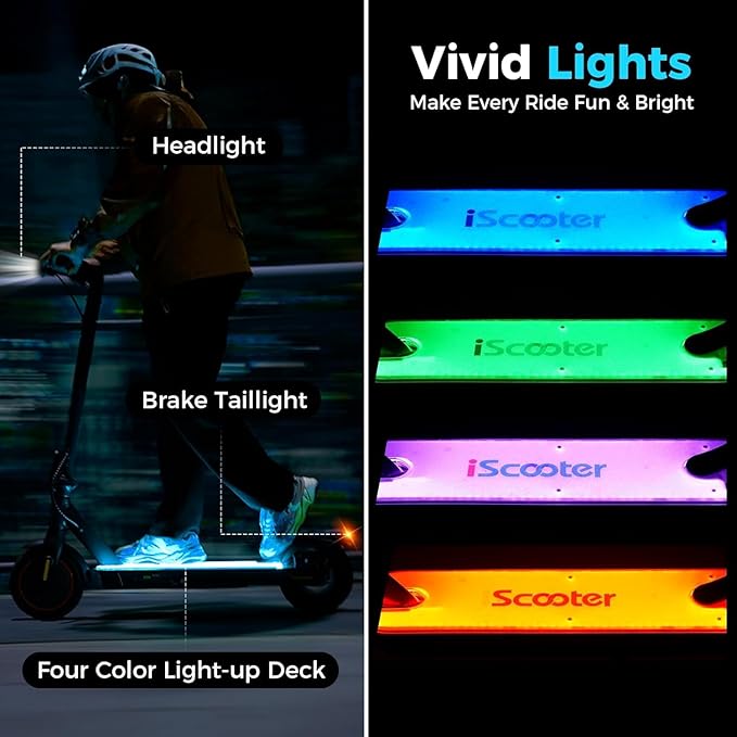 - 【Vibrant Footboard Lights & Night Visibility】Stand out with four-color footboard lighting (blue, purple, green, orange) that adds style and enhances visibility in low-light conditions. Combined with a bright headlight, brake light, and turn signals, the i9L ensures safe night riding while making every trip more exciting