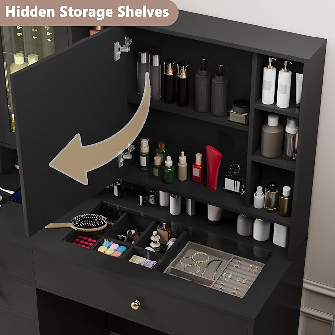 Makeup Vanity Desk with Mirror and Lights, Black Vanity with Glass Top, Jewelry Storage, Power Outlets, 3 Drawers & 2 Cabinets, Adjustable LED Lighting, Dressing Table for Women & Girls Bedroom
