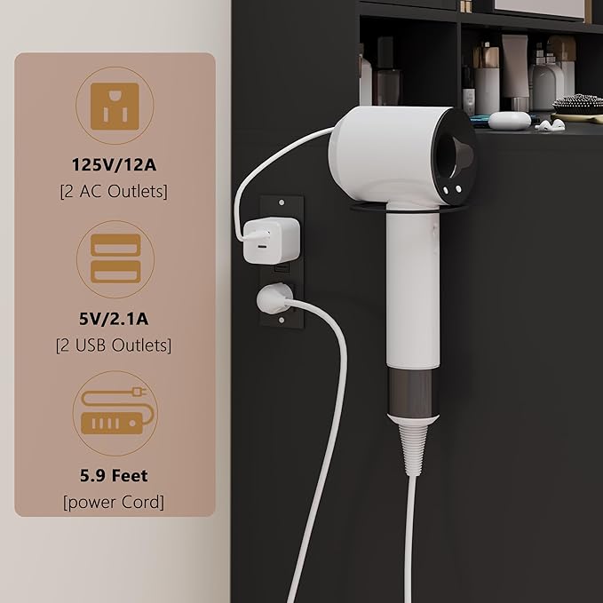 - 【Built-In Charging Station & Hair Dryer Holder】Equipped with 2 AC outlets and 2 USB ports, this vanity desk lets you conveniently charge your devices or power hair tools while getting ready. The built-in hair dryer rack adds extra convenience and organization