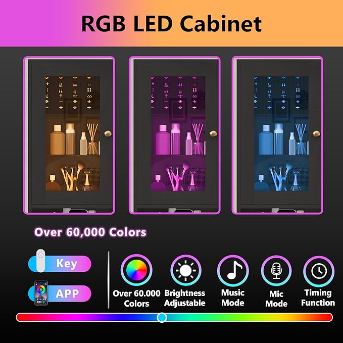 - 【RGB Cabinet Lighting & Jewelry Display Shelf】Set the mood with built-in RGB lights, controlled via app or switch. The top shelf includes a recessed jewelry organizer, perfect for displaying earrings and accessories in an elegant, dust-free way. A stylish combination of aesthetics and functionality