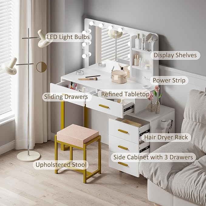 - Vanity Mirror with Lights Desk and Chair: This makeup vanity desk with mirror and lights dimensions: 44.1"W x 15.7"D x 52.3"H, included a upholstered stool (17.1"W x 12.2"D x 19.1"H). White vanity table with golden handle, adding a touch of elegance to your room