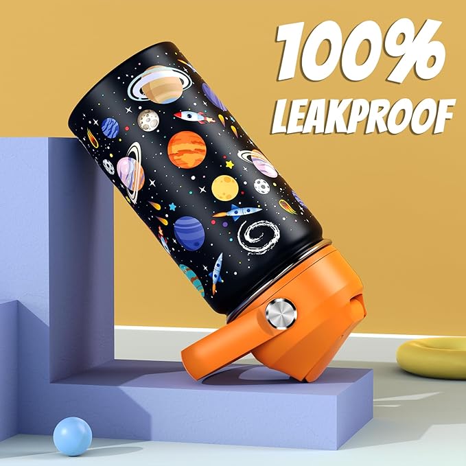 14oz Kids Insulated Water Bottle with Straw Lid - 18/8 Stainless Steel Kid Cup Travel Tumbler Double Wall Vacuum Leak Proof Portable Toddler Water Bottle (Space)