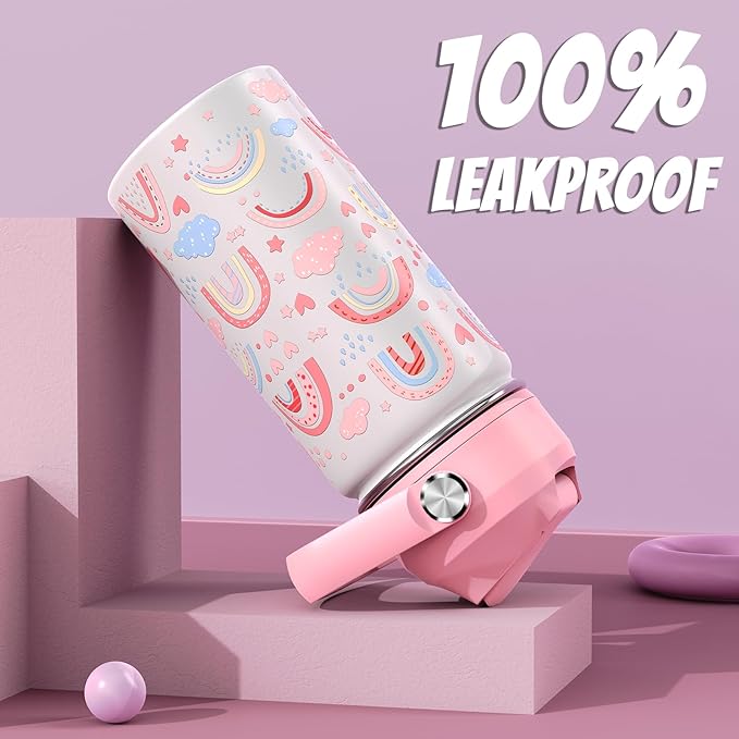 - 【INSULATED & LEAK-PROOF】With double-walled vacuum insulation, our kids cup can maintain beverage temperatures for up to 24 hours for cold and 12 hours for hot, which prevents the mug from sweating, ensuring mess-free transportation of your kids' favorite drinks to keep them hydrated. In addition, the seal zone technology in the lids of these sippy cups guarantees 100% leak-proof and spill-proof stainless steel water bottles.