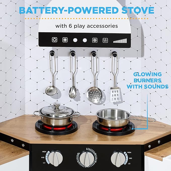 - L-SHAPE DESIGN: A convenient construction allows this playset to fit comfortably in the corner of any room, so your child can engage in hours of kitchen adventures!