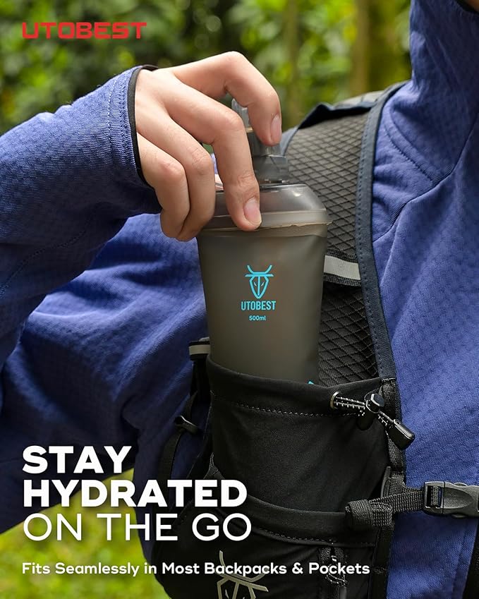 UTOBEST 500ml Soft Flask, 2 Pack Flexible TPU Hydration Water Bottle, Collapsible with 28mm Caliber for Running, Hiking, Cycling, Climbing, and Marathon Blue