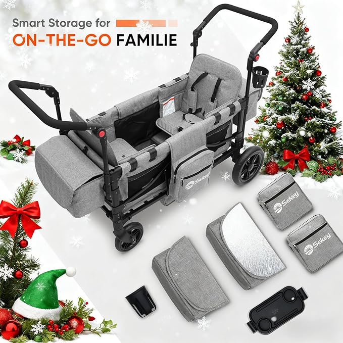 Sekey Wagon Stroller for 2 Kids, Luxury 4-in-1 Stroller Wagon - Premium Quality with Convertible Seats, Adjustable Push Handles, Removable Canopy, Snack Tray & Cooler, US Certified. Gray