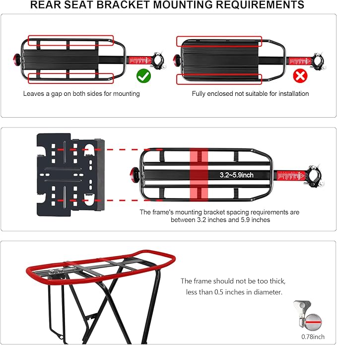 - 【INSTALLATION REQUIREMENTS】Only a flat bike rack is required for installation. The length from the end of the bike frame to the rear of the bike seat must be greater than 9.8 inches, the width of the bike frame must be less than 6.7 inches, and the thickness cannot exceed 0.5 inches. Please confirm the frame size before purchasing. If you have any questions about the rear seat, please feel free to contact us