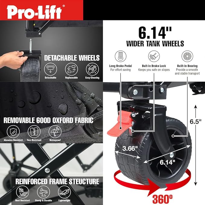 - [All-Terrain, 360° Swivel, Silent Bearing Casters] Designed with 6'' x 3.66'' 360° rotating swivel wheels that run smoothly in different terrains, such as grass, concrete, stone brick and muddy road. It allows you to easily maneuver this wagon any direction you want. The silent bearing was designed to make the wheels more stable and quiet in operation. The front wheels also have brakes that can be parked on slopes, so there's no need to worry about things dropping or losing control.