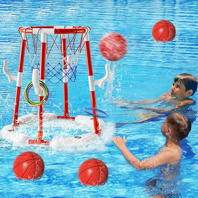 - 【FLOATING BASKETBALL HOOP SET】 Slam dunk on summer pool parties with the pool basketball hoop poolside, which includes Basketball Hoop, 12 rings, 4 basketballs and ball pump for the ultimate swimming pool party game. This pool basketball hoop poolside set which can play both shooting games and ring games is definitely the best summer pool water toys.