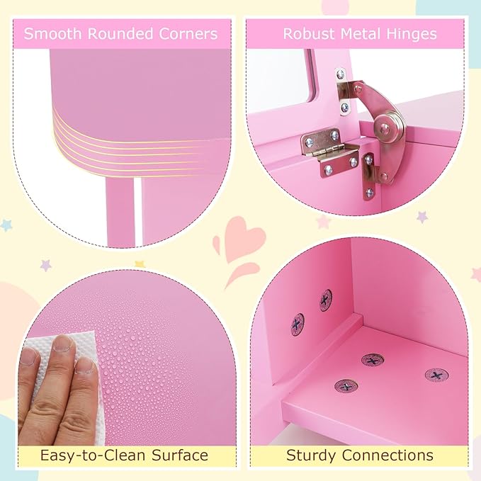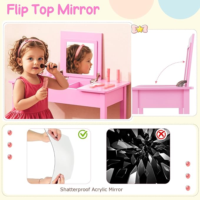 - Child-Safe Features: This ASTM and CPSIA compliant girls vanity set features a shatterproof acrylic mirror to withstand interactions. Rounded corners minimize the risk of bumps and bruises, ensuring a safer environment for your little ones.