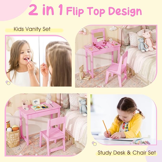Costzon Kids Vanity, 2 in 1 Girls Vanity Set with Flip Top Mirror, Hidden Storage Space, Wooden Toddler Makeup Vanity Desk Dressing Table, Kids Vanity Table and Chair Set (Pink)