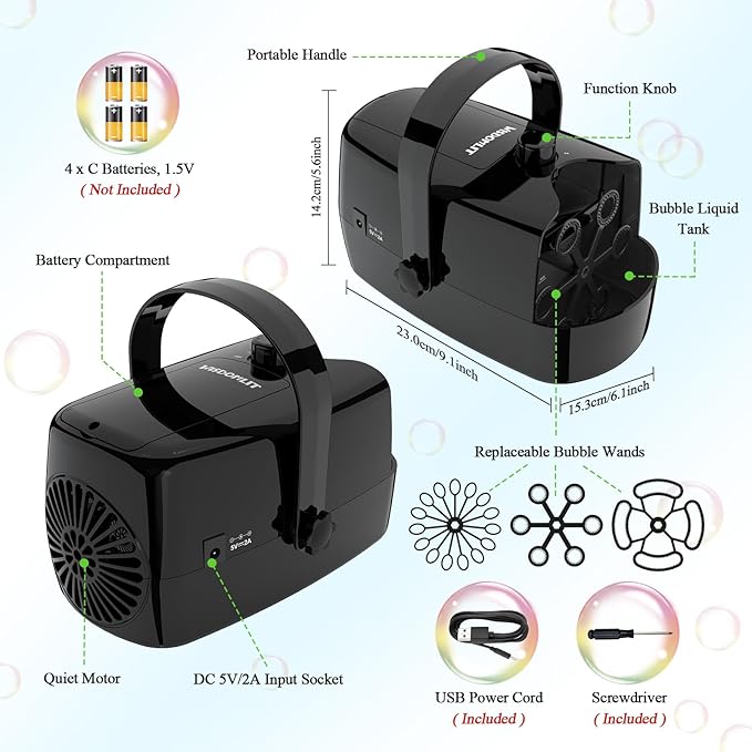 - 【3 Ways of Power Supply, USB Cable or Battery】Bubble Blower Can Be Powered by 4 Count 1.5V C Batteries (Not Included) or Plug In USB Power Cable with Adapter (Not Included), Phone Charger or Power Bank, More Convenient To Use And Enjoy The Bubbles Leisure Time Indoor and Outdoor