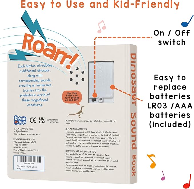 - 28 DINOSAUR SOUNDS – Press 28 buttons, each with a unique lifelike dinosaur sound, to bring your child's favourite dinosaurs to life. – Hear roars, stomps, and growls from 28 different dinosaurs, turning every page into a prehistoric adventure.