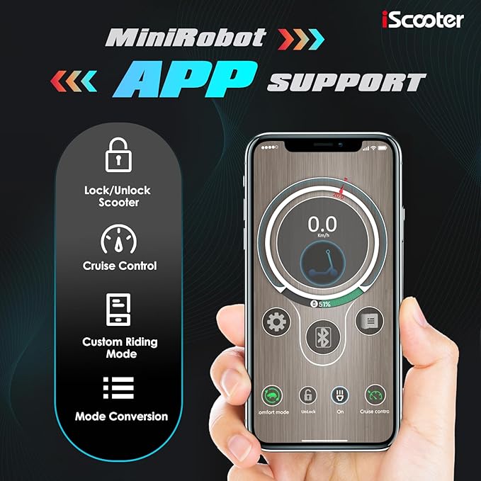 - 【Foldable, Smart, and Built for Convenience】The MiniRobot app allows you to adjust speed settings, track battery life, and lock your scooter for added security. IPX4 water resistance ensures durability in light rain, while a 6-7 hour charge time keeps you ready to ride