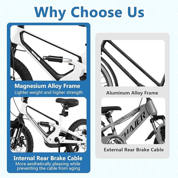 - [ Enhanced Stability & Durability ]: This children's bicycle is crafted from a magnesium alloy frame, which features lighter weight and higher strength compared with the aluminum alloy frame. Plus, the internal rear brake cable design makes it more aesthetically pleasing while preventing the cable from aging.