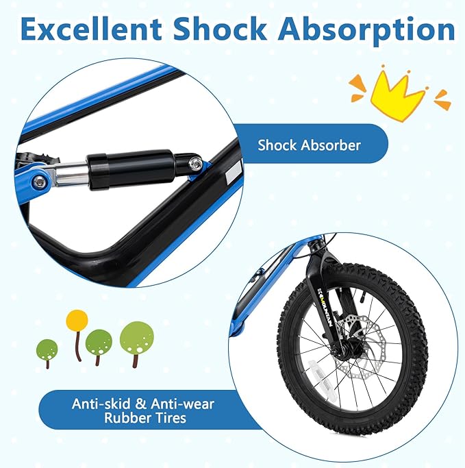 - [ Designed for New Riders ]: Equipped with detachable training wheels, this 16-inch bicycle is perfect for beginners learning to ride. The anti-skid & anti-wear rubber tires provide better grip and resilience on varied terrains. Moreover, the addition of a shock absorber offers enhanced control for smooth rides.
