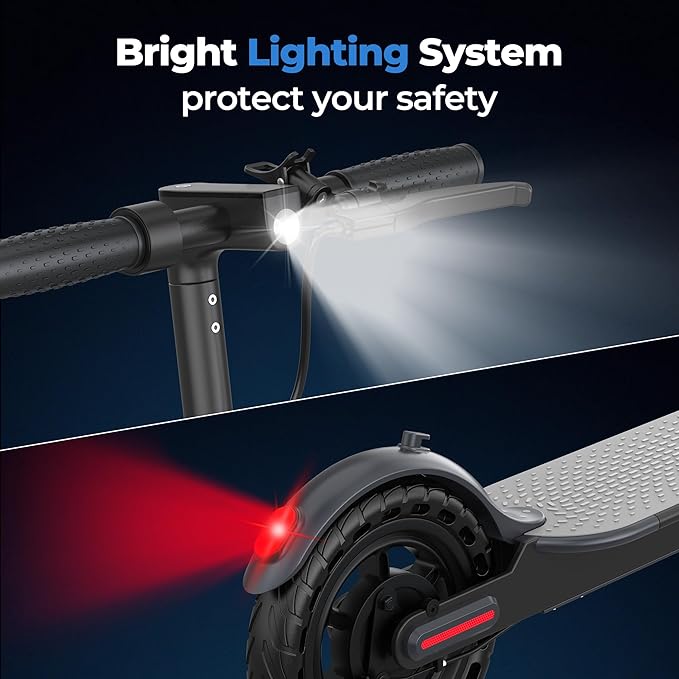 - đź›´Safety Riding: Tested by UL2272, it's professional and reliability. Featuring dual braking system(drum brake and EABS regenerative anti lock braking) and double light system(bright headlight and taillight), V7 escooter ensures safety at anytime and anywhere.