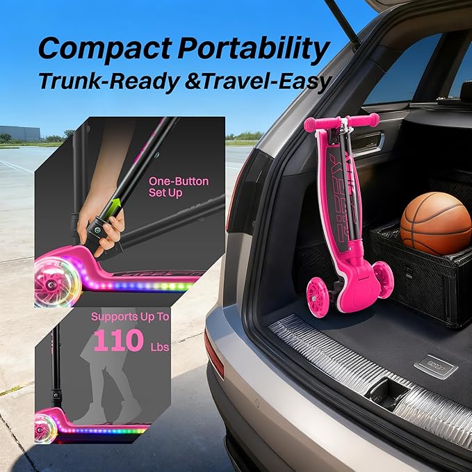 - Compact & Portable – No Assembly Required: Thoughtfully designed to grow with your child, this scooter requires no installation and features a 4-level adjustable handlebar (25.5 / 29.1 / 31.1 / 32.6 inches), ensuring a comfortable fit for years to come. The one-step folding system and lightweight design make it easy to carry and store—perfect for trips to the park, school, or family vacations.