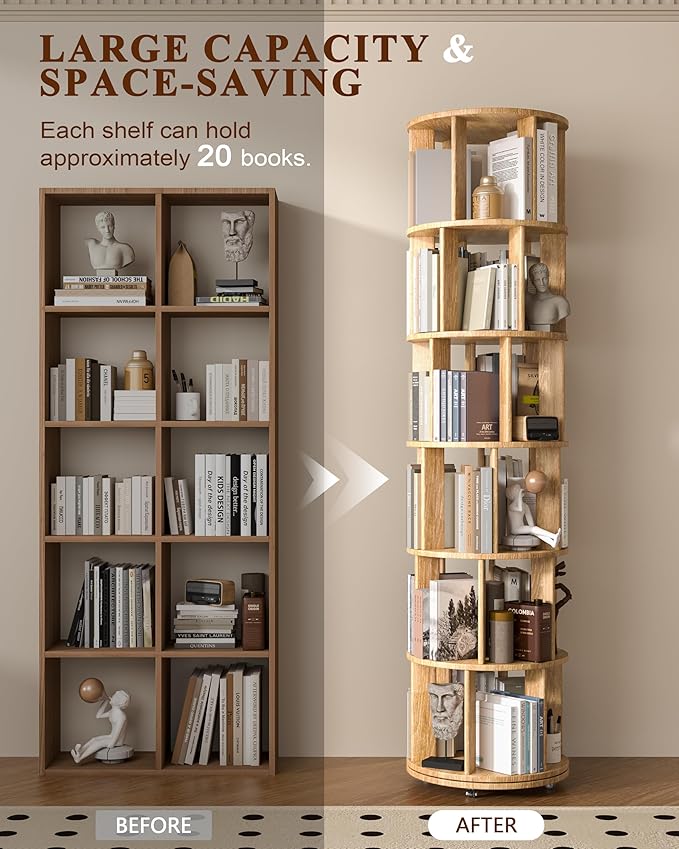 - 【Large Capacity Rotating Bookshelf】6 tier rotating bookshelf holds up to 120 books (20 per tier),with a maximum weight capacity of 65lbs per tier, brilliantly organizing storybooks for kids, novels for adults, and photo albums for grandparents. Its circular design maximizes space, making it ideal for living rooms, bedrooms, offices, or kids' rooms