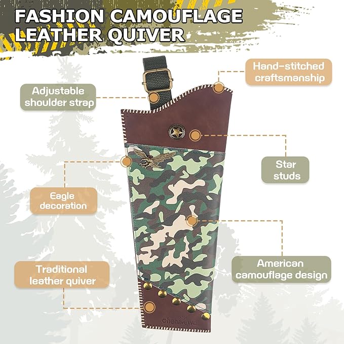- Designer Leather Quiver: The leather quiver features custom-made camouflage printed leather, with hand-stitched edges and antique brass rivets. Adjustable crossbody/back carry fits all ages - the perfect kids bow and arrow accessory. The stars and eagle motifs represent classic American elements, and the overall style is fashionable