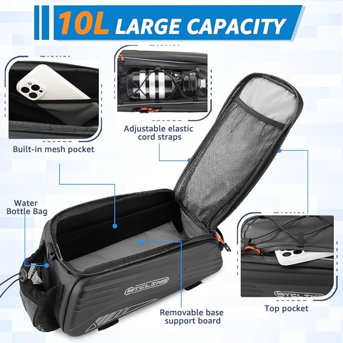 WOTOW Bike Rear Rack Bag - 10L Hard Shell Waterproof Bike Trunk Pannier with Shoulder Strap, Reflective Bicycle Rear Rack Saddle Seat Bag for Travel Outdoor Cycling Ebike Accessories