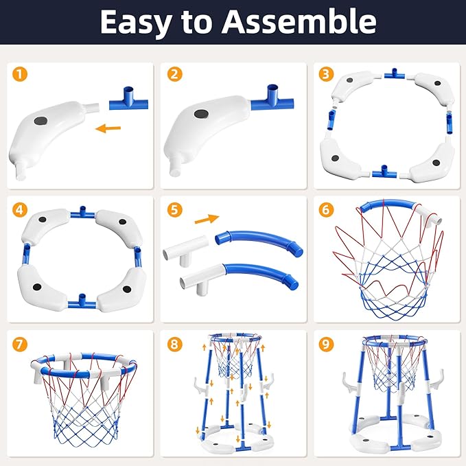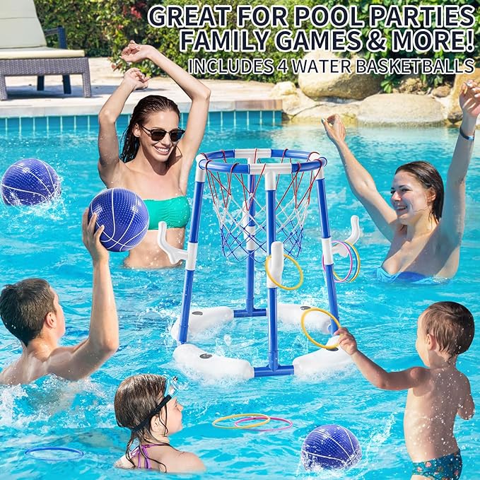 - Summer Pool Toy Set - Kids basketball set comes included 1 Basketball Hoops, 12 rings, 4 basketballs and ball pump. Perfect Pool Games Water Basketball Toy for kids, adults and family party!