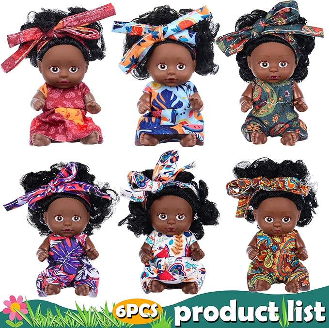 6 Pack 4 Inch African Girl Dolls Set - Black Mini Dolls with Colorful Outfits & Hairbands β Gift for Girls 3-6, 6-12 Educational Toys & Decorative Figures