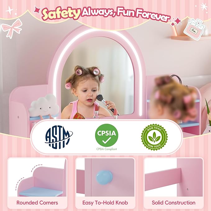 - Safety-Focused & Durable Design: Our vanity is crafted from premium MDF. It is designed with safety and longevity in mind. The rounded corners and smooth, burr-free surface minimize the risk of accidents during play. Rigorously tested to meet ASTM F963-17 and CPSIA safety standards for your peace of mind.