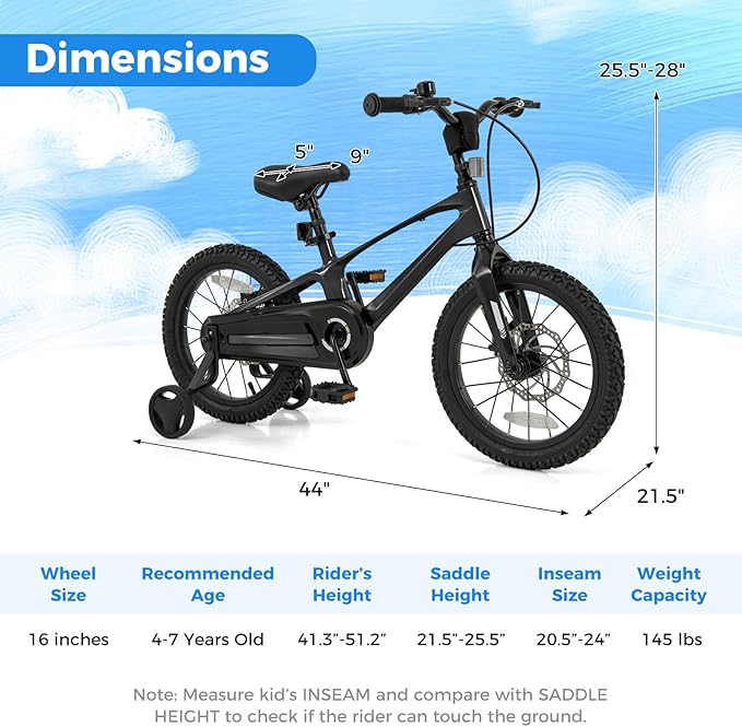 - [ Superior Magnesium Alloy Frame ]: Featuring a sturdy and anti-deform magnesium alloy frame, the 16 inches kids bicycle is strong enough to withstand multiple bumps. The lightweight magnesium alloy frame also makes it easy to carry and transport. Plus, there are inner brake cables hidden in the frame for rust inhibition.