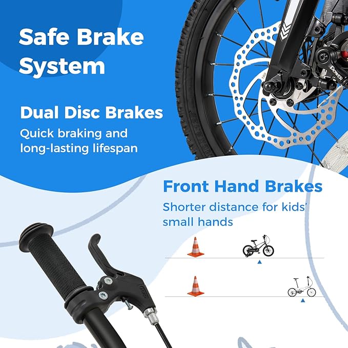 - [ Equipped with Dual Disc Brakes ]: The kids bike has dual disc brakes for quick braking and long-lasting lifespan. The front hand brakes are designed with shorter distance for kids' small hands to control the bicycle. Moreover, the fully enclosed chain guard prevents kids' feet from getting pinched for increased safety.