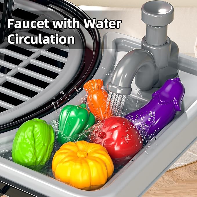 - Role-playing Toys: Play grill set for kids ages 4-8 is easy to assemble and features faucet with water circulation. Girls pretend to wash, cut and cook the play food sets for kids kitchen and play with other kids or parents