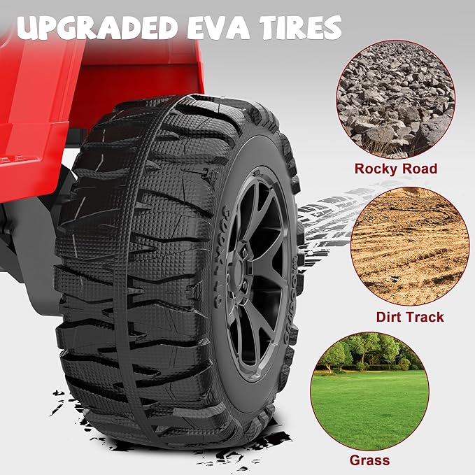 - 【Ideal for Off-Roading】This 24 volt ride on toys for boys features four upgraded EVA tires for superior grip and shock absorption. Combined with an advanced four-spring suspension system absorbs shocks and bumps with ease, while the 11-inch high chassis safely passes obstacles, our kids cars to drive provides a smoother ride, making it easy to traverse rough terrain. Get ready for a real adventure