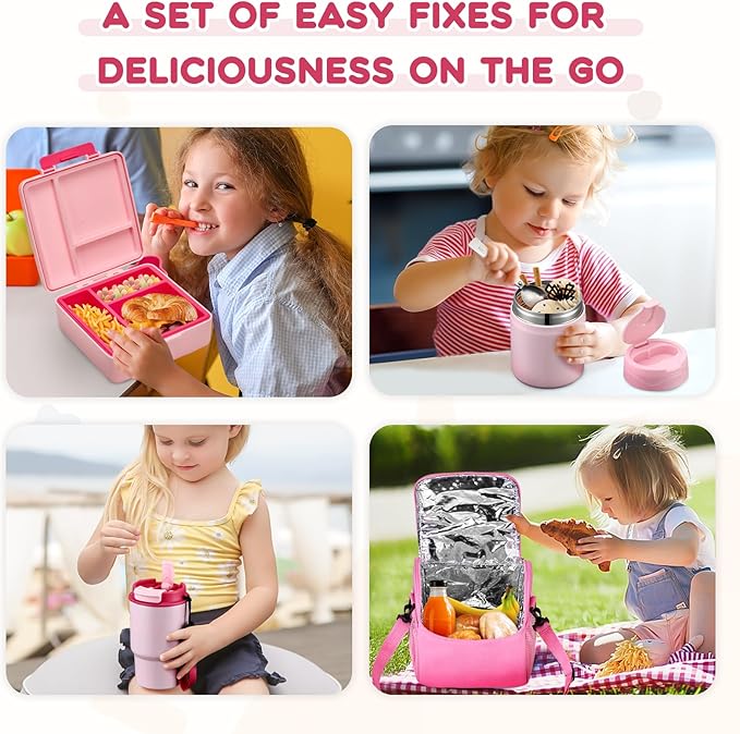 - All in-Meal Prep Solution – Includes a kids friendly bento box (removable ice grid & detachable inner tray), 17OZ insulated food jar with foldable spoon, 13.5OZ kids’ water bottle, and a thermal-insulated carry bag. Perfect for meals, snacks, drinks, and on-the-go convenience.