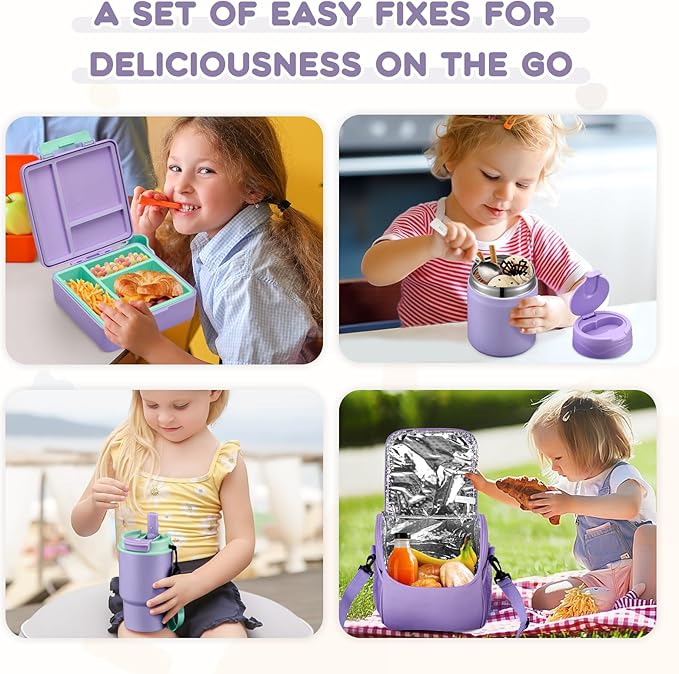 Lunch Box Set with Bento Box Container, 17OZ Stainless Steel Food Soup Thermo, Kids Water Bottle & Portable Insulated Lunch Bag – Leakproof, Hot/Cold Retention for School, Travel (Purple)