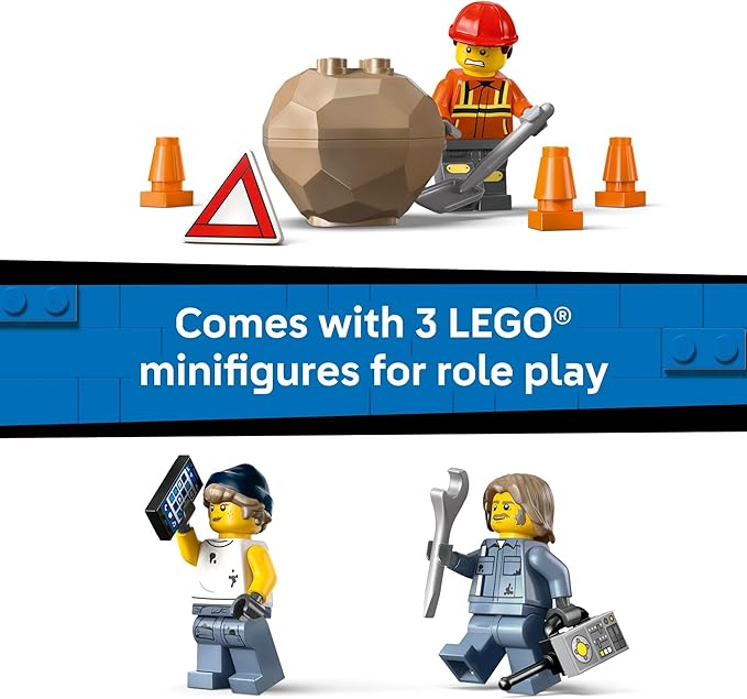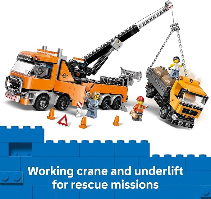 - WHAT'S IN THE BOX? – Includes a powerful tow truck with a working crane, a dump truck with boulder cargo, a restraining chain, and 3 tow truck worker minifigures