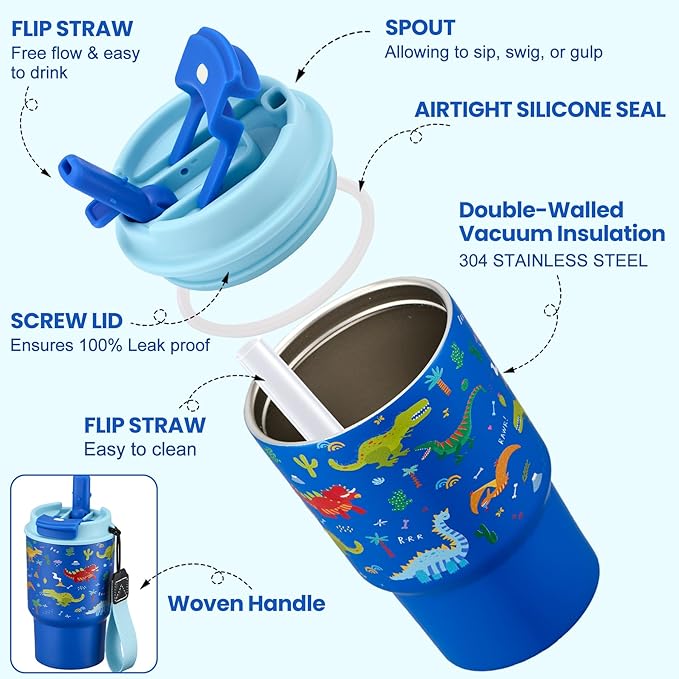 - 14oz Dual Drinking Spout Kids Insulated Water Bottle: This toddler water bottle is double vacuum insulated to keep drinks warm for up to 8 hours. The sealing technology in the lid ensures that each insulated water bottle is 100% leak and spill proof. Sweat-proof kids' water bottles come with a braided rope carry handle to take kids' drinks on the go and keep them hydrated. The dual spout and straw design makes it easy for kids to drink in different scenarios.
