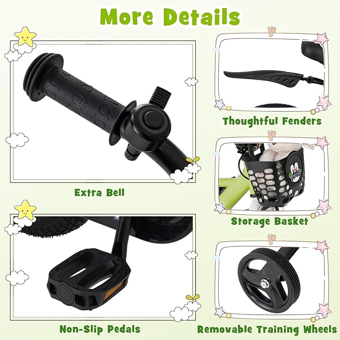 - [ More Child-friendly Design ]: This bicycle is designed with more details for added fun and convenience, such as the extra bell, removable storage basket, and thoughtful fenders. Lovely patterns appeal to kids. Plus, the ergonomic seat offers kids comfortable support. The non-slip pedals provide kids with a safe riding experience.
