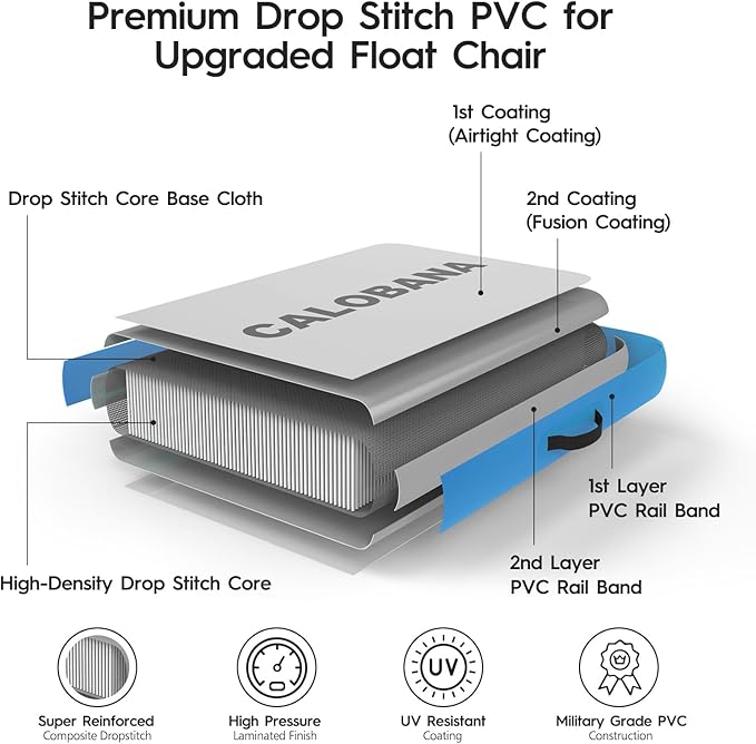- Premium Quality Construction: Experience unparalleled buoyancy and durability with our CALOBANA Pool Float Chair, crafted from woven drop stitch PVC material. This high-quality construction supports weights up to 300 pounds, making it ideal for both relaxation and fun in the water. Whether you're lounging by the pool or drifting down a river, enjoy peace of mind knowing you’re supported by a robust float that’s built to last