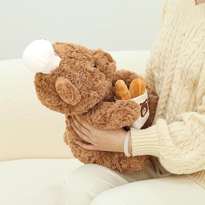 PEACH CAT Chef Teddy Bear Stuffed Animal Holds Toast Bread Bag Cute Bear Plush Soft Plushies Toy Pillow Gifts for Kids Brown 9.8"