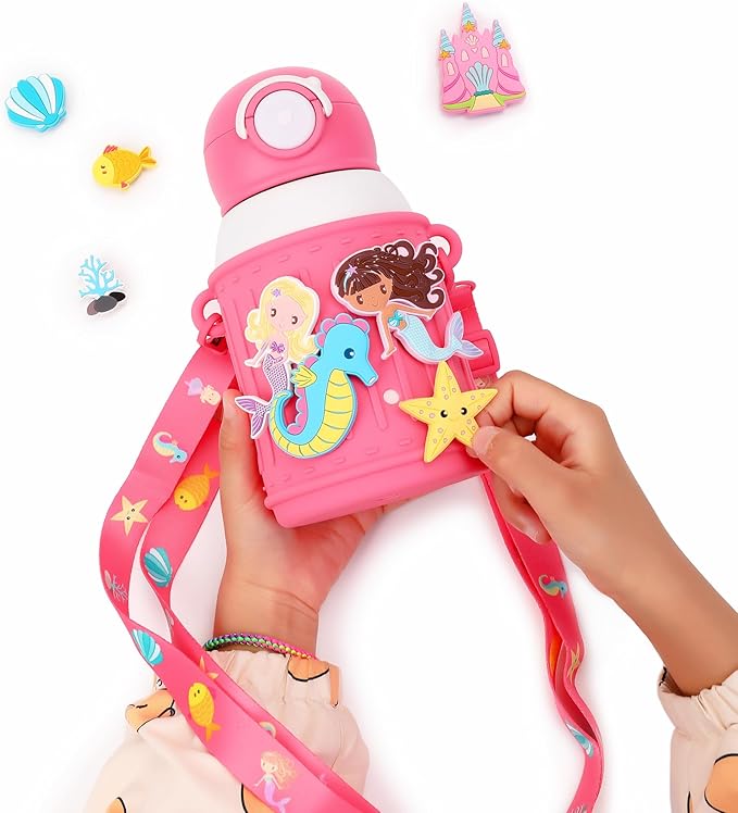 Kids Insulated Tumbler Set – 16 oz Stainless Steel Bottle with 2 Lids (Straw + Pour), Screw-On Cup, Adjustable Strap, Silicone Sleeve + 8 Charms – BPA-Free, Gift-Ready (Mermaid)