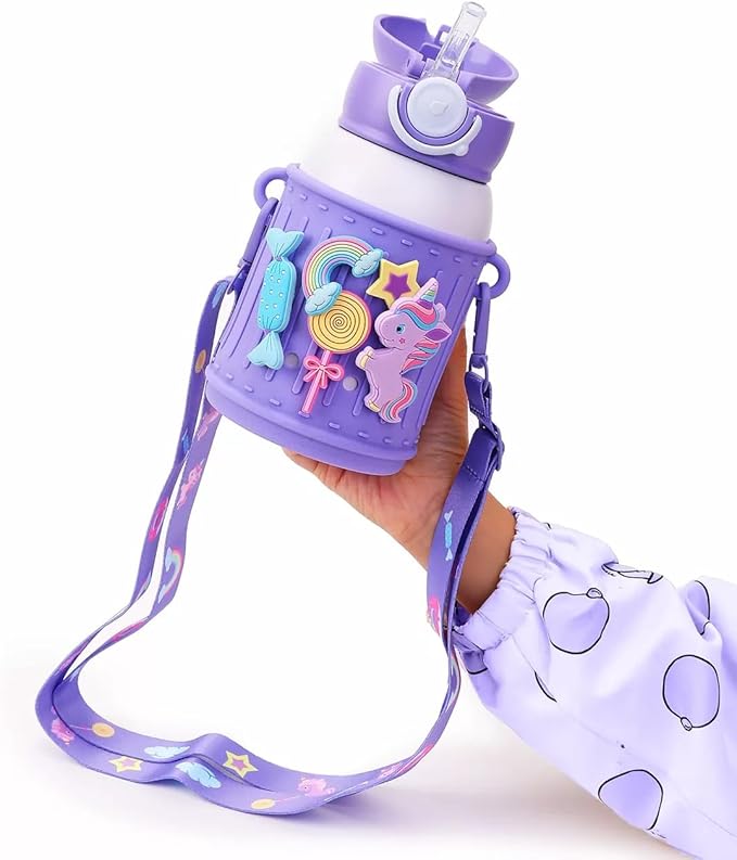 - SAFE, VERSATILE & KID-FRIENDLY – Recommended for ages 3+. The 16 oz size is ideal for school, daycare, sports, family travel, or relaxing at home, and works perfectly for water, juice, milk, smoothies, or even hot cocoa. Bottle and lids are dishwasher safe, while the silicone sleeve, charms, and strap should be hand-washed. Do not microwave. Built tough for everyday adventures, this reusable tumbler combines safety, convenience, and playful design.