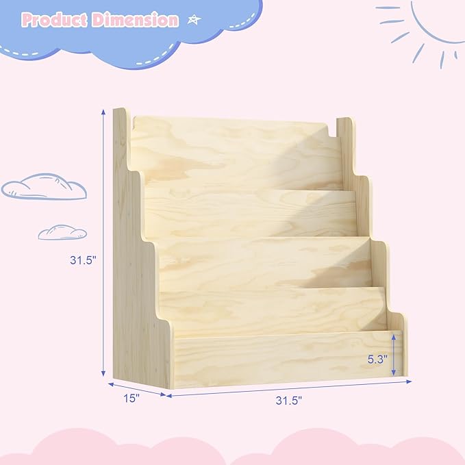 - 4-tier Kid Bookshelf:This bookshelf organizer features a multi-layered design, making it easy to display books facing forward.The size of this children's bookshelf is 31.5 inches * 15 inches * 31.5 inches,the size of toddler bookcase allows kids to reach their favorite books with ease.