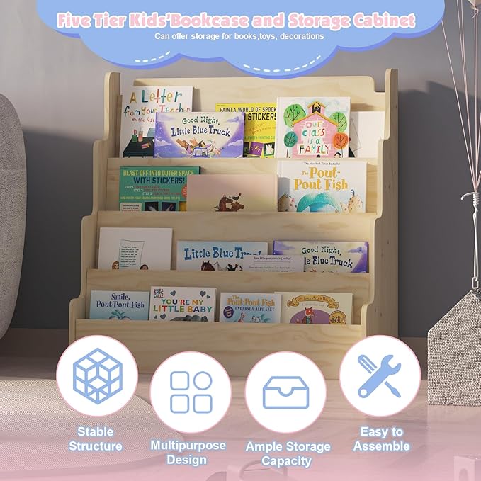 - Suitable for Multiple Scenes:The four-tier open display design creates an open environment for children's group activities, encouraging them to read and play together. The book display shelf design is suitable for any room or environment. Perfect for storing books in your child's bedroom, playroom, nursery, classroom, kid’s room reading area, library, or living room.
