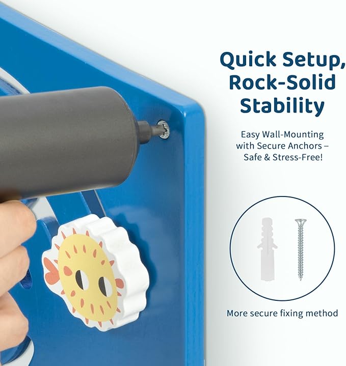 - Montessori Education:Our whale busy board will turn any room into a vibrant play space. The Montessori wall activity board will engage your child's imagination and is designed to help toddlers recognize colors and shapes while improving fine motor skills, sensory development, logical thinking, music appreciation and more