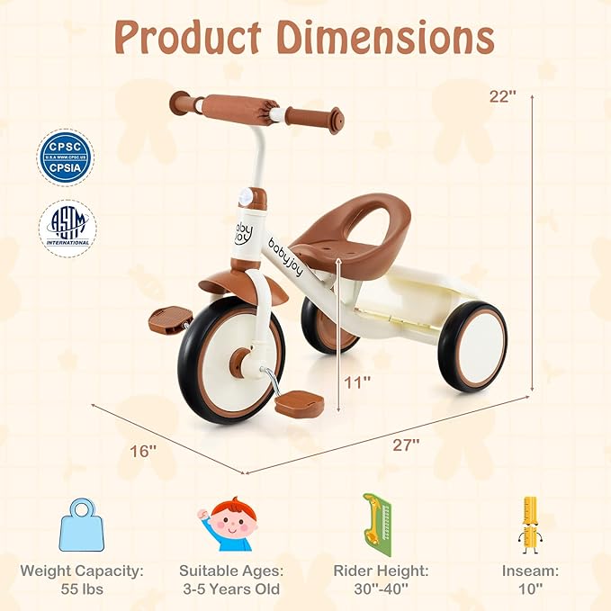 BABY JOY Toddler Tricycle, Kids Trike with Adjustable Seat and Storage Basket for Boys Girls Indoor and Outdoor Riding, Toddler Trike for Baby 3-5 Years Old (Beige)