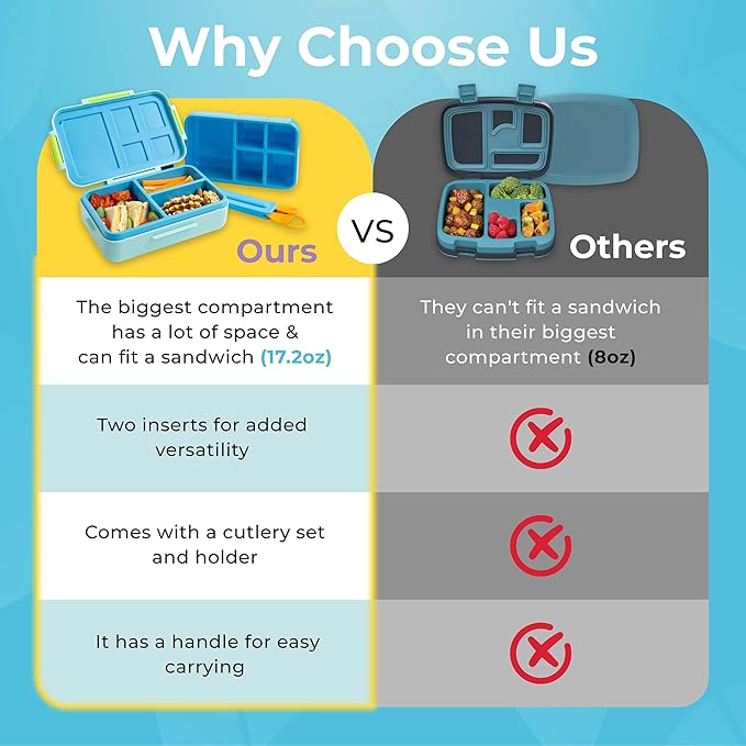 - Leakproof Kids Lunch Box for School: Say goodbye to spills with our bento box for kids. Designed for ages 3-12, this lunch box kids love keeps food separate and mess-free, even between compartments.
