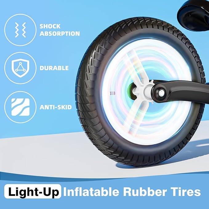 - 【GLOWING AIR RUBBER TIRES】Featuring air-filled rubber tires for superior shock absorption and a smooth ride on grass, gravel, and pavement. The built-in motion-activated lights require no batteries—just spin the wheels to illuminate their adventure, adding extra fun and visibility.