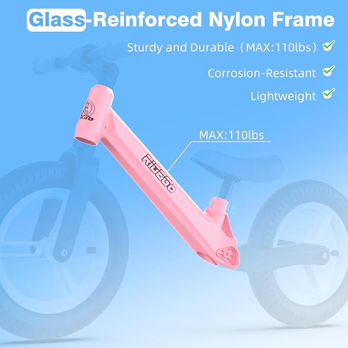 - 【LIGHTWEIGHT & DURABLE FRAME】 Built with a glass-reinforced nylon frame, this kids balance bike 3+ year old matches the strength of carbon steel, supporting up to 110 lbs while weighing only 7.06 lbs. The corrosion-resistant frame prevents rust, ensuring durability. Lightweight and easy to handle, it's perfect for kids to ride and parents to carry.